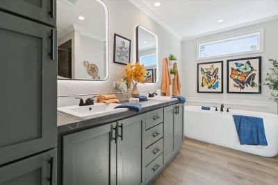 Luxurious primary bathroom with dual sinks and a separate tub and shower